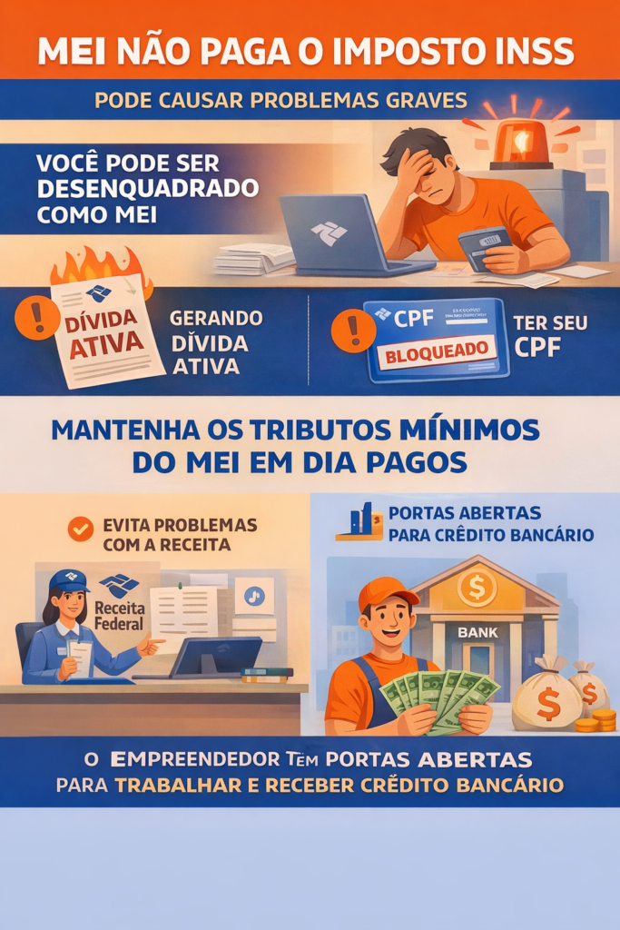 MEI QUE NÃO PAGA O IMPOSTO INSS , PODE SER DESENQUADRADO COMO MEI , GERANDO DÍVIDA ATIVA E ATÉ TER SEU CPF BLOQUEADO . E BOM MANTER OS TRIBUTOS MÍNIMOS DO MEI EM DIA PAGOS , ALÉM DE EVITAR PROBLEMAS COM A RECEITA O EMPREENDEDOR TEM PORTAS ABERTAS PARA TRABALHAR E RECEBER CRÉDITO BANCÁRIO IMAGEM