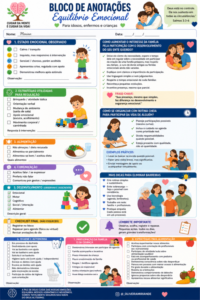 ESTRATÉGIAS PARA ALIMENTAÇÃO( ) Aceitou experimentar novos alimentos( ) Participou com orientação de profissionais (ex: nutricionista)( ) Participou de atividade/aula sobre alimentação saudável( ) Está em acompanhamento com pediatra ou profissional de saúde( ) Demonstrou consciência sobre não desperdiçar( ) Pensou em pessoas com menor acesso à alimentação( ) Foi grato durante a alimentação( ) Resistiu às orientações( ) Demonstrou comportamento de deboche( ) Ignorou propostas sobre não desperdício( ) Apresentou recusa alimentar significativa Observação: ______________________________________💡 Dica importante para manter o equilíbrio do material:Mesmo quando registrar comportamentos desafiadores (como deboche ou recusa), tente sempre acompanhar com uma observação neutra e uma estratégia aplicada. Isso mantém o tom profissional, acolhedor e construtivo — exatamente a proposta do seu bloco.