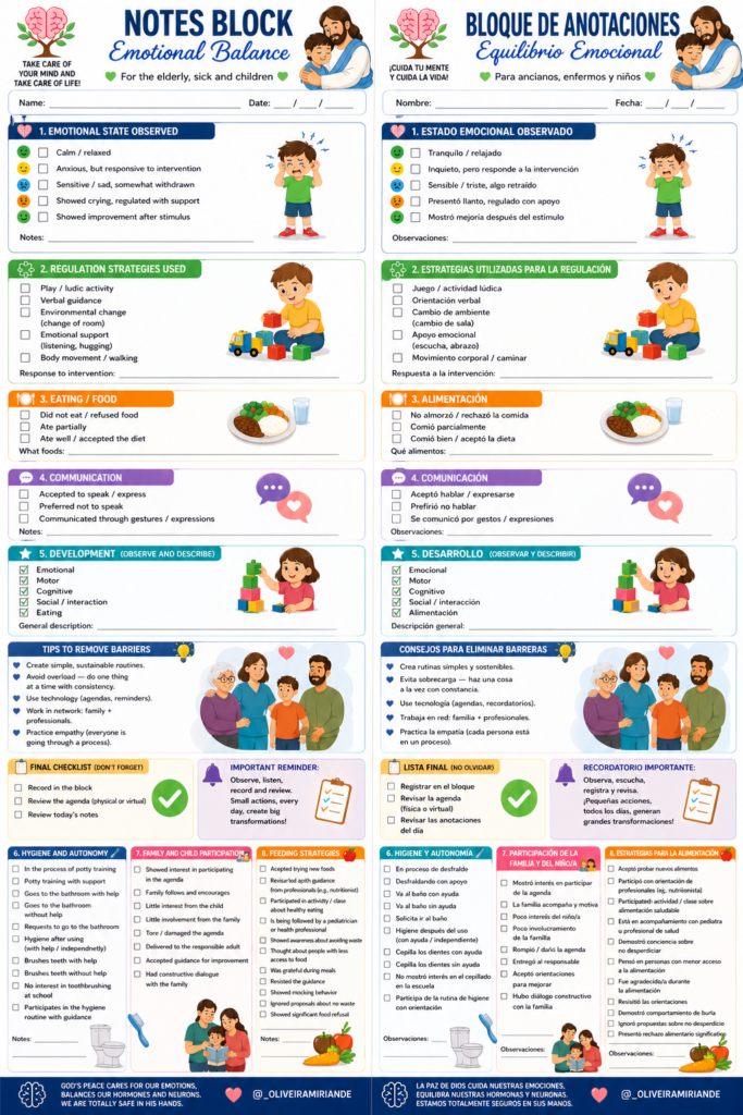_🇪🇸 ESPAÑOL😊 1. ESTADO EMOCIONAL OBSERVADO( ) Tranquilo / relajado( ) Inquieto, pero responde a la intervención( ) Sensible / lloroso, pero contenido( ) Presentó crisis, regulado con apoyo( ) Mostró mejora después del estímuloObservaciones: ____________________________🧩 2. ESTRATEGIAS UTILIZADAS PARA LA REGULACIÓN( ) Juego / actividad lúdica( ) Orientación verbal( ) Cambio de ambiente (salir del aula)( ) Apoyo emocional (escucha, acogida)( ) Movimiento corporal / caminarRespuesta a la intervención: ____________________________🍽️ 3. ALIMENTACIÓN( ) No comió / rechazó la comida( ) Comió parcialmente( ) Comió bien / aceptó la dietaQué alimentos: ____________________________💬 4. COMUNICACIÓN( ) Aceptó hablar / expresarse( ) Prefirió no hablar( ) Se comunicó por gestos / expresionesObservaciones: ____________________________⭐ 5. DESARROLLO (OBSERVAR Y DESCRIBIR)( ) Emocional( ) Motor( ) Cognitivo( ) Social / interacción( ) AlimentaciónDescripción general: